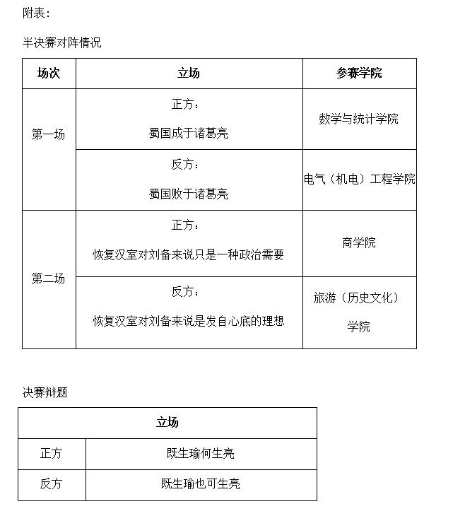 云顶国际平台网址第31届“雄才韬略”辩论赛半决赛及决赛、颁奖仪式将在4月13日(周五)下午2:30在云顶国际平台网址大学生活动中心举行。半决赛对阵情况已经确定(见附表),决赛阶段也不再抽签,半决赛第一场胜出的队伍将作为决赛的正方,半决赛第二场胜出的队伍将作为决赛的反方。