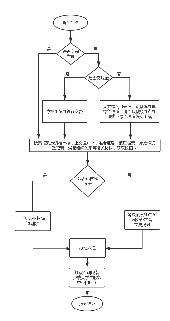1.新生到校后,首先到录取学院新生接待处,提交录取通知书、准考证、身份证(查验无误后退回)、2寸彩色照片4张、高招纸质档案、党团组织关系等,接受资格初审;办理数字迎新报到手续,领取 “校园卡”,根据已选择或已分配的房间,到所在公寓楼值班室办理入住手续安排住宿。已在线选房的同学也可先到公寓楼存放行李,再到学院迎新点办理注册手续;