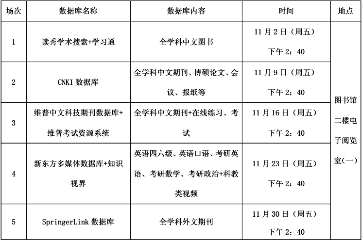 2.参与方式:图书馆届时将邀请各数据库服务商专业讲师来校培训,学生团体参加请提前2天预约,联系电话:4369202;学生个人或教师个人参加请按讲座时间提前10分钟到场即可。