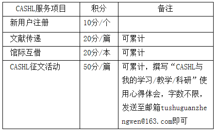 为促进文献资源共享服务,最大限度发挥国家人文社科文献保障平台的作用,图书馆联合中国高校人文社会科学文献管理中心(China Academic Social Sciences and Humanities Library,CASHL)隆重推出“开世攒积分 览文送大奖——CASHL集市等你来”活动,用户不仅可以免费获得所需文献,还能攒积分换奖品。