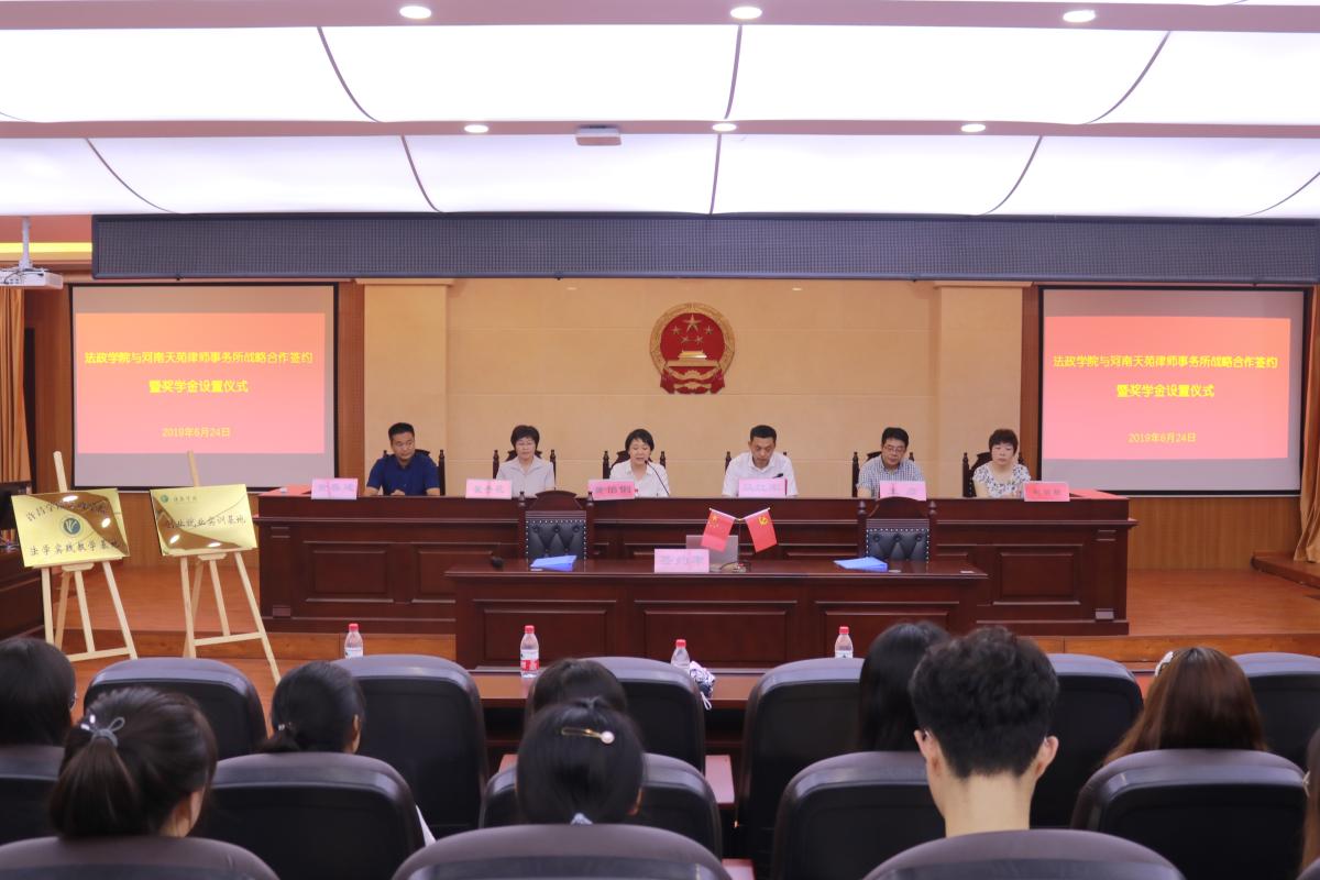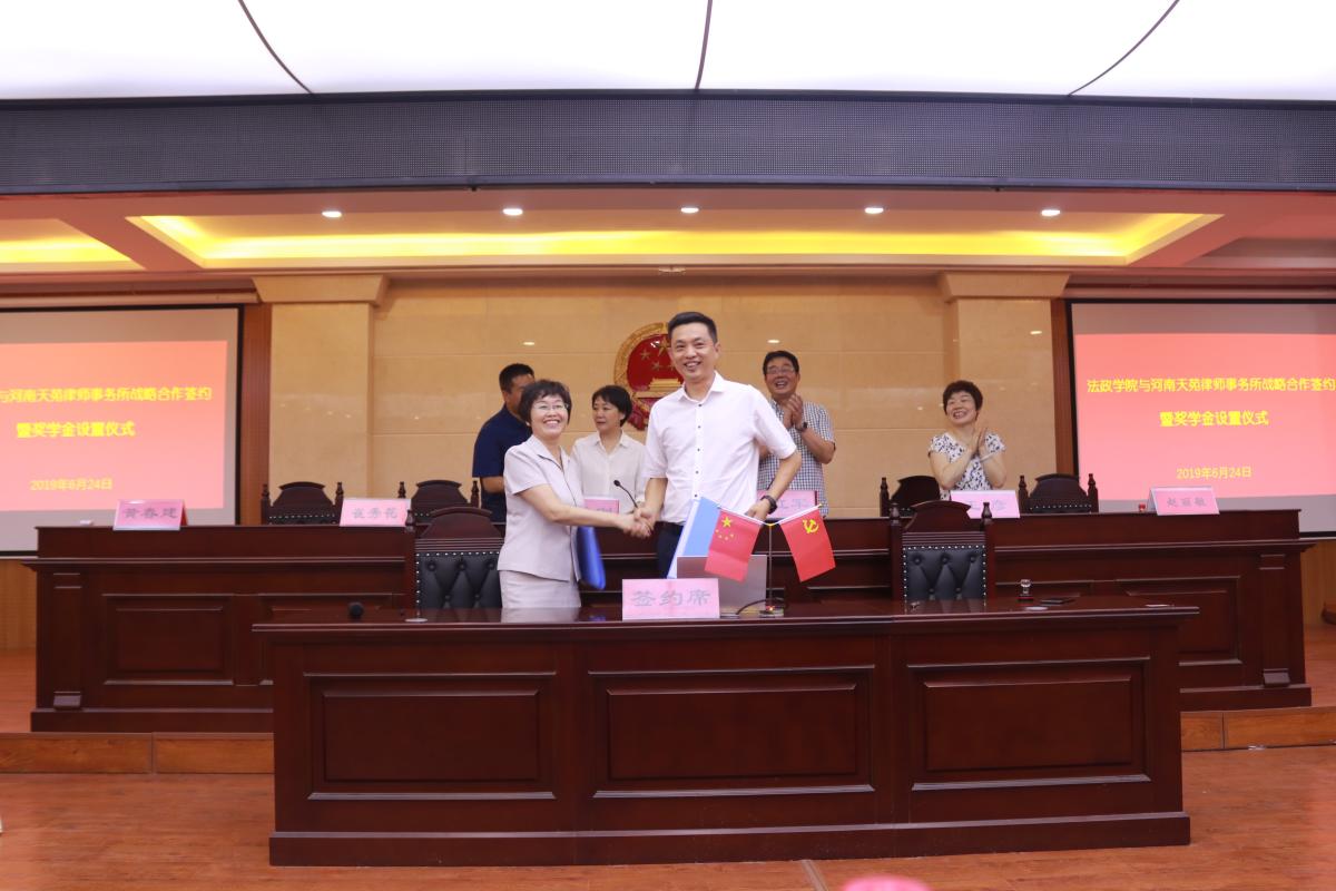 6月24日上午,云顶国际平台网址法政学院与河南天苑律师事务所在C合二模拟法庭举行战略合作签约暨奖学金设置仪式。副院长黄怡俐、河南天苑律师事务所主任马红军出席会议,党委宣传部、法政学院等相关负责同志及法政学院全体师生参加了签约仪式。