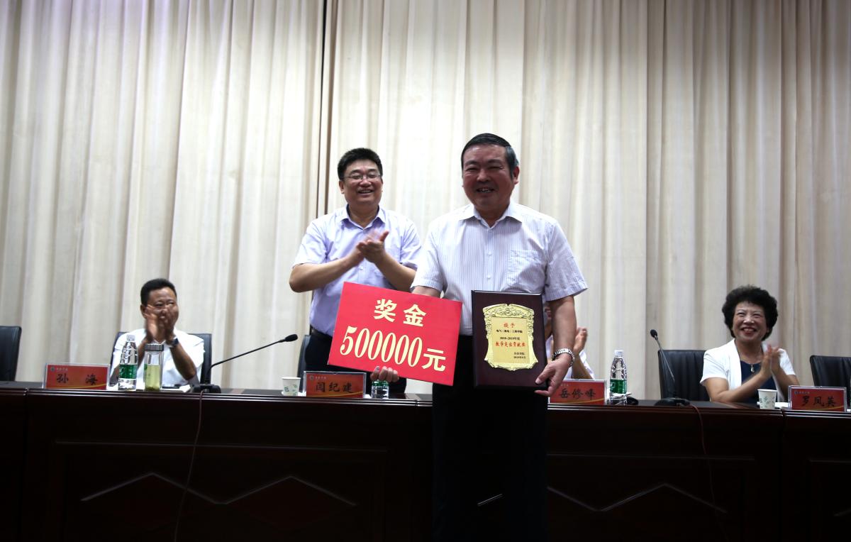 闫纪建、岳修峰等出席会议的学校领导为获得表彰的先进单位和先进个人颁发了奖牌、奖状和荣誉证书。