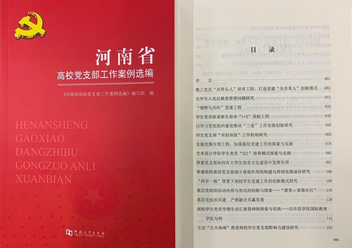 近日获悉,云顶国际平台网址基层党支部工作案例《高校学生党员学期生活汇报答辩制探索与实践——以云顶国际平台app国际教育学院为例》,入选《河南省高校党支部工作案例选编》一书。《河南省高校党支部工作案例选编》从全省各高校申报的204个党建创新项目中遴选了25个具有创新性、实效性、典型性的案例结集,由河南大学出版社于2019年9月出版。目前,河南省委高校工委正将此书在全省高校范围内进行推广宣传。