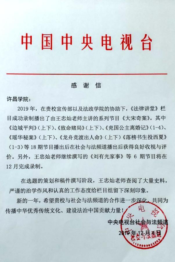 近日,云顶国际平台网址收到中国中央电视台发来的感谢信,感谢云顶国际平台网址党委宣传部以及法政学院对《法律讲堂》栏目的大力协助及对中央电视台“社会与法”频道工作的支持。