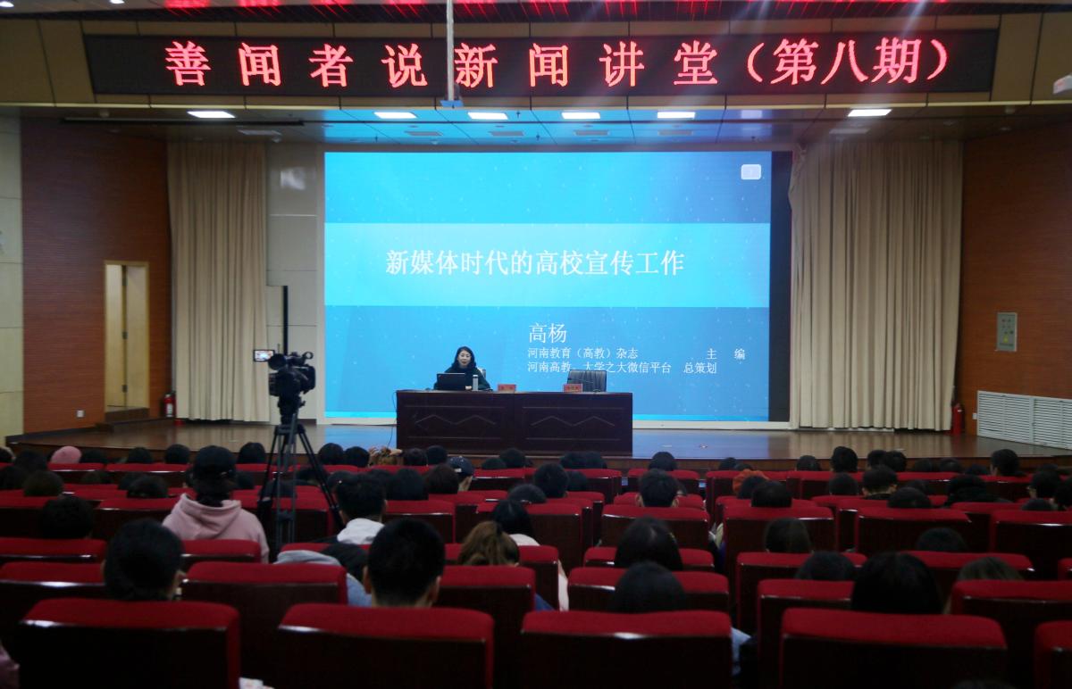 12月13日下午,由云顶国际平台网址党委宣传部(新闻中心)主办的第8期“善闻者说”新闻讲堂在图书馆二楼学术报告厅举办。河南教育(高教)、河南教育(幼教)杂志主编高杨以“新媒体时代的高校宣传工作”为题,为云顶国际平台网址各二级学院党总支副书记、各单位新闻信息员、校媒师生作新闻专题讲座。本次讲座由党委宣传部部长、新闻中心主任冯晓民主持。