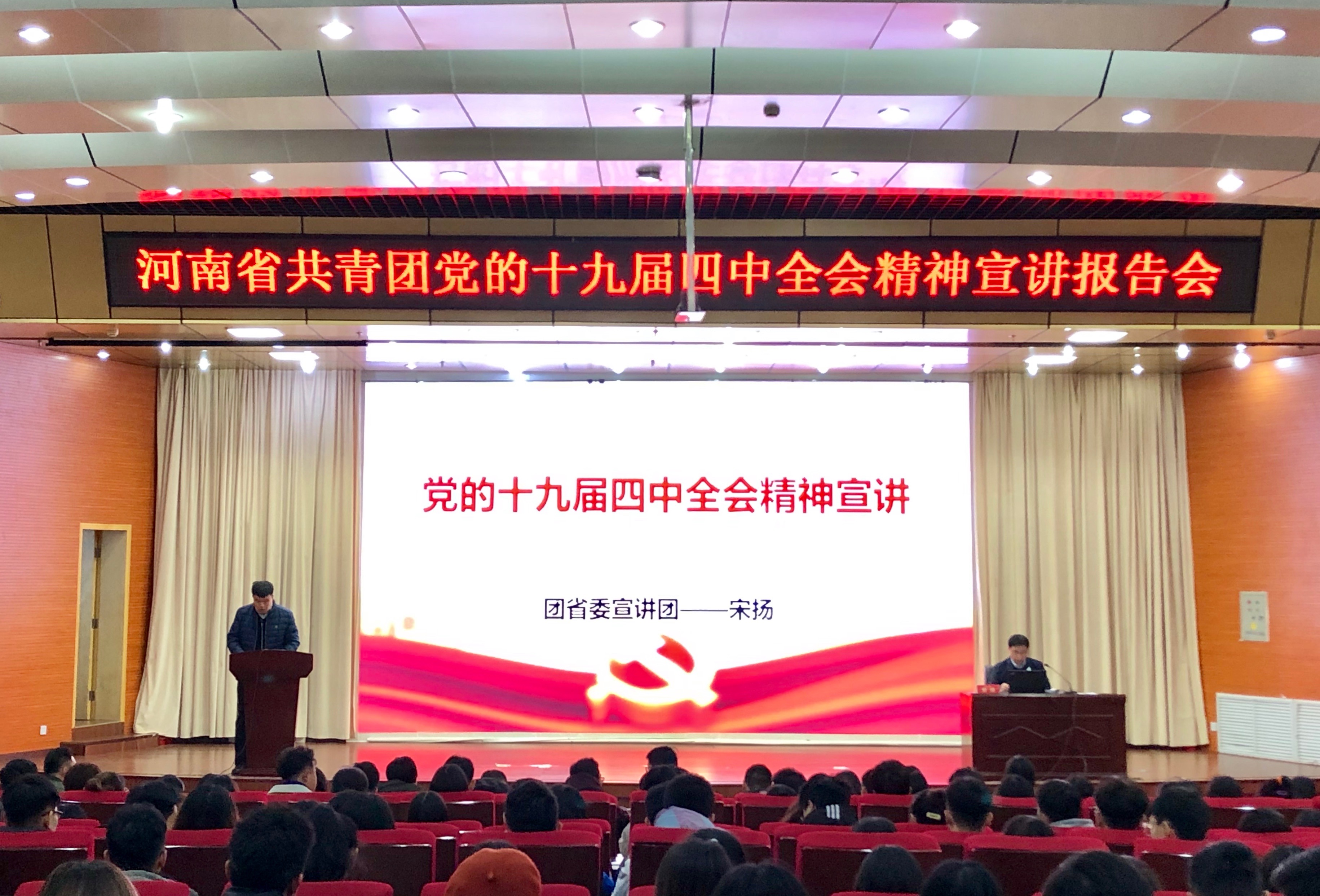 12月27日,共青团河南省委宣讲团成员、河南省青少年全媒体中心负责人宋扬来到云顶国际平台网址,向广大师生宣讲党的十九届四中全会精神。云顶国际平台网址各二级学院分团委、团总支书记、学生团总支副书记、学生会主席、二级学生分会主席、团支书、社团部部长和基层团支书代表共计360余人到场聆听报告。